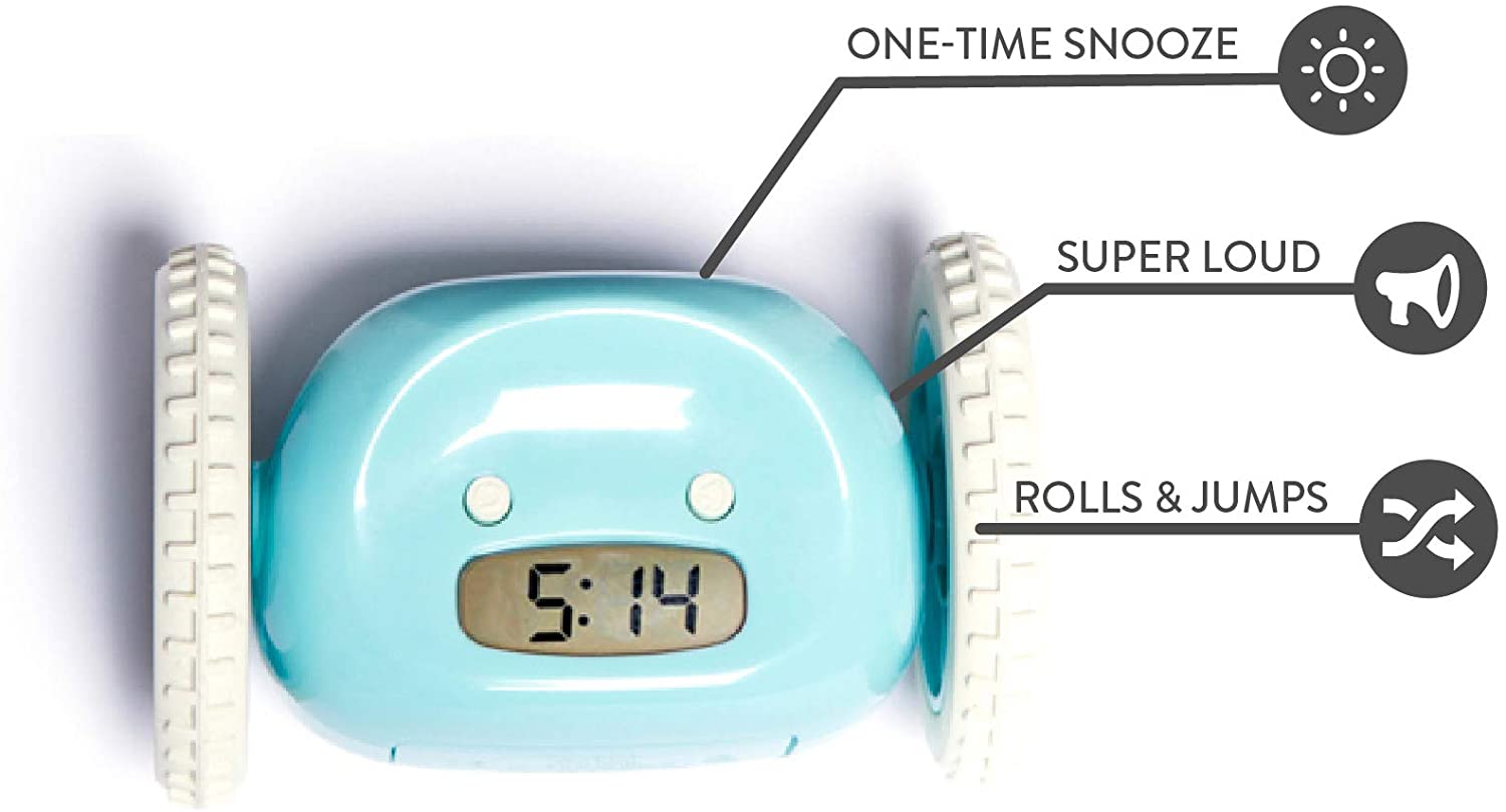 | Clocky (Clockie), the original Nanda alarm clock, the best wake-up call for heavy sleepers. | Clocky is the only bedside rolling alarm clock that will run away, hide, chase, roll, wheel, beep, and jump. | He’s the funniest, most annoying alarm clock, loud enough to get you up on time. | The perfect gift for graduation, college dorm room, back-to-school, or anyone starting a new job. Never be late again! |