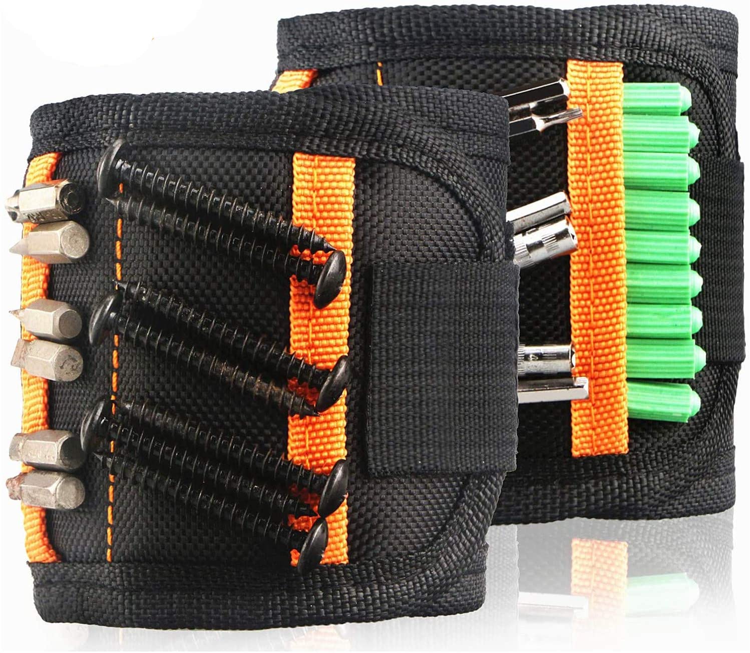 | The magnetic wristband can be worn in a variety of ways. It can also be used as a lightweight tool belt. It is more convenient when you work on the stairs. 15 powerful magnets can hold metal tools, rubber plugs, cable ties and other non-magnetic items. Put it in 2 pockets for added convenience. |