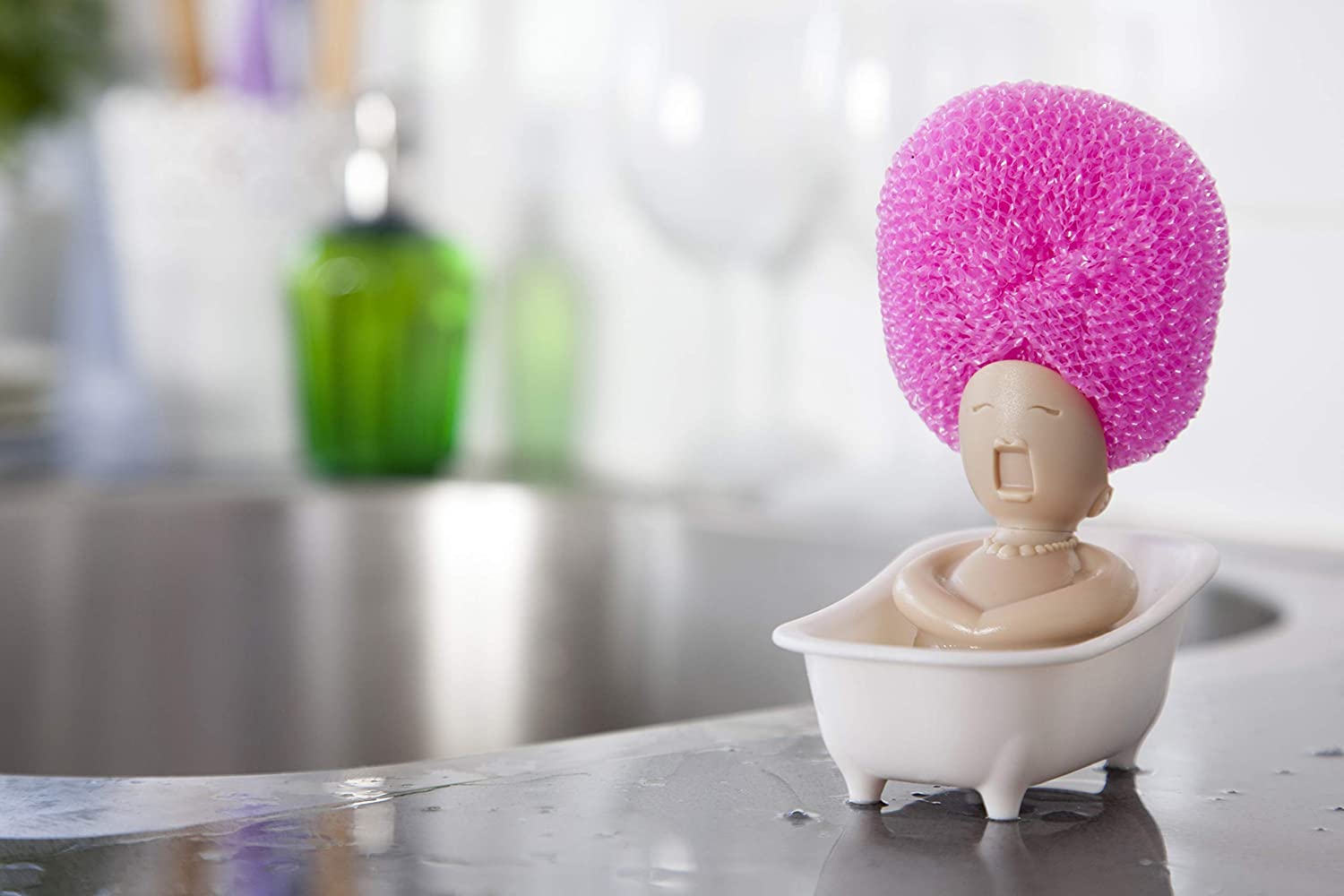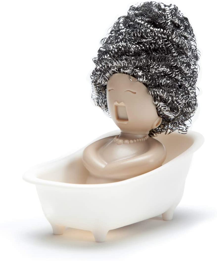 This lovely little bath singer will hold your scrubber. No need to go to a hair salon – you can change her style by switching to a different scrubber.